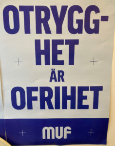 Slagord som alla kan hålla med om oavsett politisk färg är ”Otrygghet är ofrihet”, som det står på en tredje tavla.