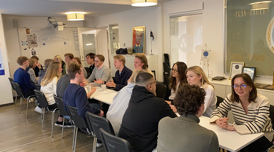 Till en början kan man som utomstående tro att det är ett speeddejting-event anordnat av en dejtingsajt. Men det är i stället Moderata ungdomsförbundet i Göteborg (Muf) som håller sin veckovisa måndagsfika på kansliet. Här kan det vara aktiviteter som debattkvällar, föreläsningar och laserdome. Eller som i dag, introduktionskväll för nya medlemmar.